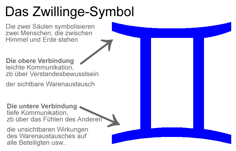 Zwillinge ist das Prinzip des Handels und der Kom­muni­kation. Hier wird also deine Kom­muni­kation und Aus­tausch mit anderen geprüft. Ein ganz­heit­licher Aus­tausch sollte immer auf der be­wussten Ebene und auf der un­be­wussten Ebene gut und heilsam für alle Be­teiligten sein (siehe im Zwillinge Symbol die Ver­bindung der beiden Säulen oben und unten !)