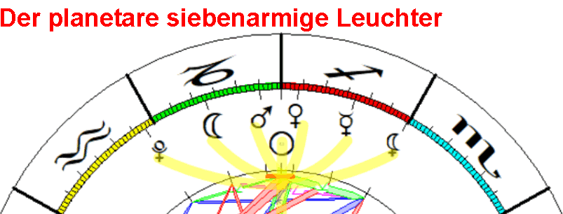 Das Besondere an diesem Horoskop ist die Ansammlung von all den Planeten links und rechts oben um die Sonne. Es ist wie ein sich zu einem zentralen Ereignis zusammenzufinden, und weil es sich aber mit einer solchen Präzision ausprägt, dass die Sonne immer zentral im Mittelpunkt steht (astrologisch Halbsummen genannt) wirkt es wie eine Zeremonie ! Wie ein zeremonielles Treffen für ein Ritual, wie ein globales epochales Ereignis. Es ist die Konstellation des siebenarmigen Leuchters, eine Konstellation die ich in dieser reinen Form noch nie in einem Horoskop gesehen habe. Die Sonne steht in der Halbsumme zwischen Mars und Venus, in der Halbsumme zwischen Mond und Merkur und in der Halbsumme zwischen Pluto und Lilith. Weil es nun im Zusammenhang mit diesem siebenarmigen Leuchter einiges gibt was man besser in einem Video zeigen kann habe ich dazu ein Youtube Video hochgeladen.